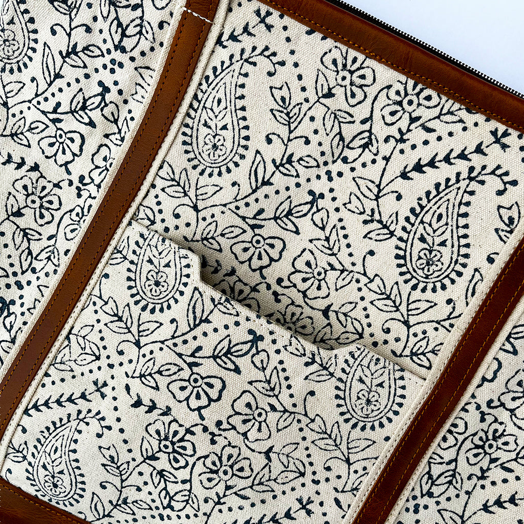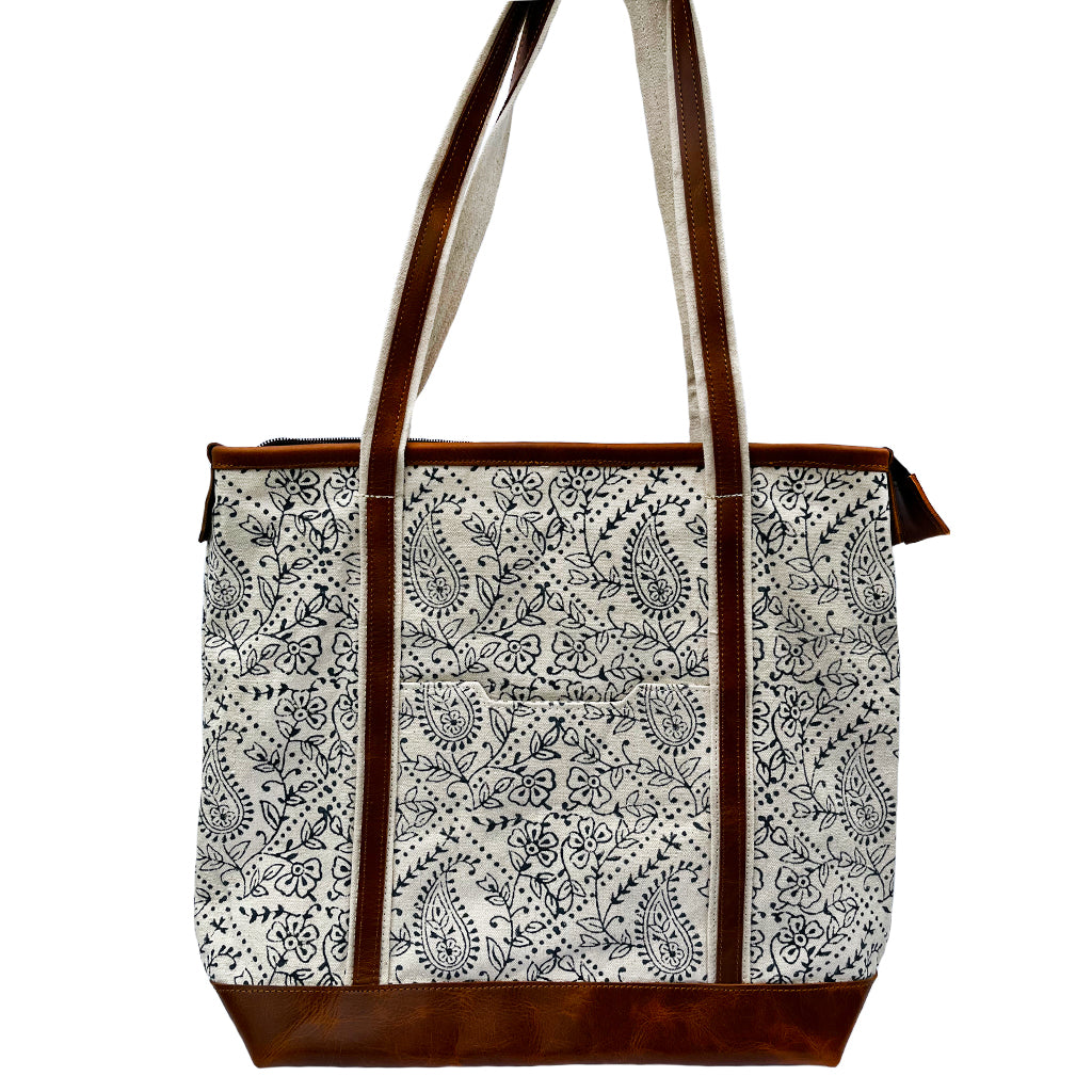 This all-purpose tote is handmade from hand-blocked canvas and full-grain buffalo leather. The bag comes with a slip pocket as well as a zipped pocket. Perfect for storing your phone and valuables. Sturdy enough for your laptop and all your daytime needs.