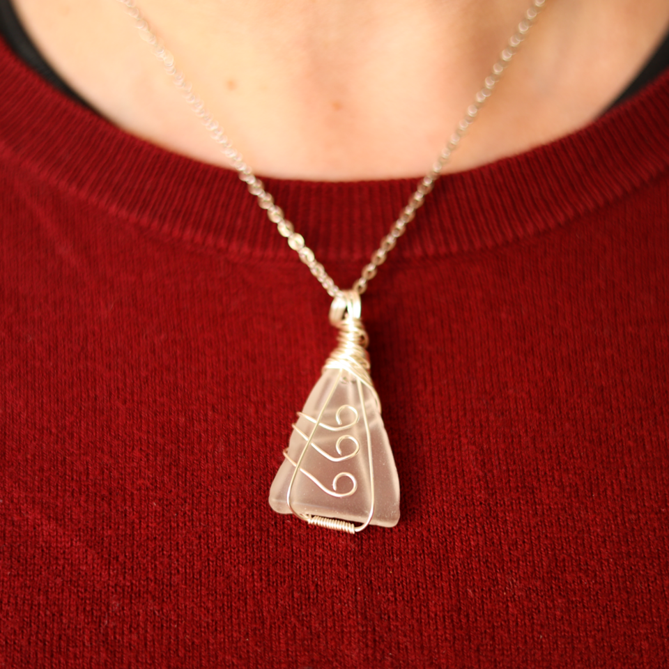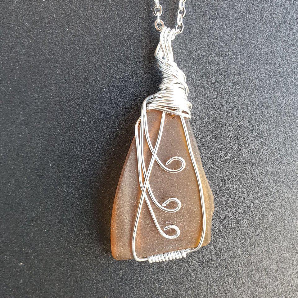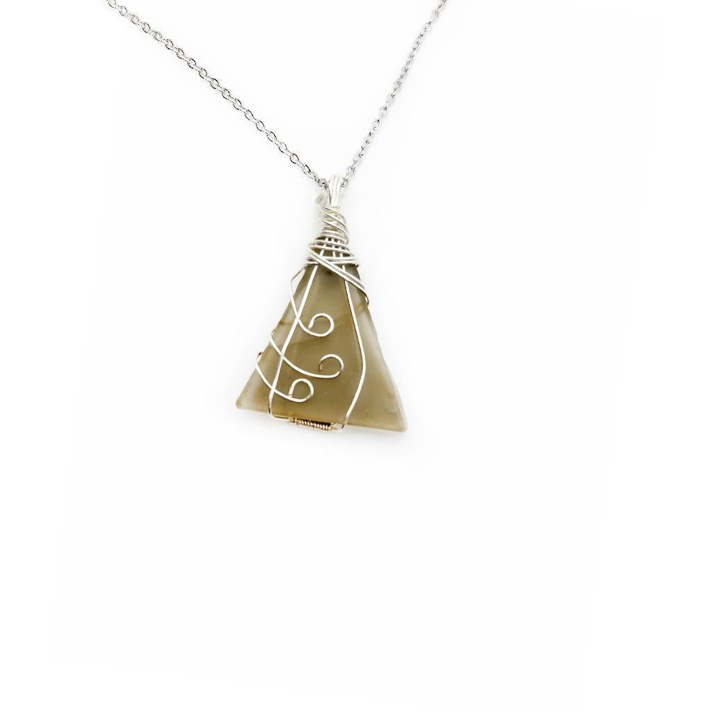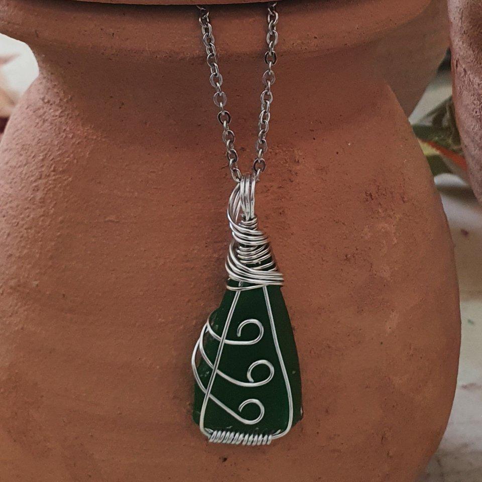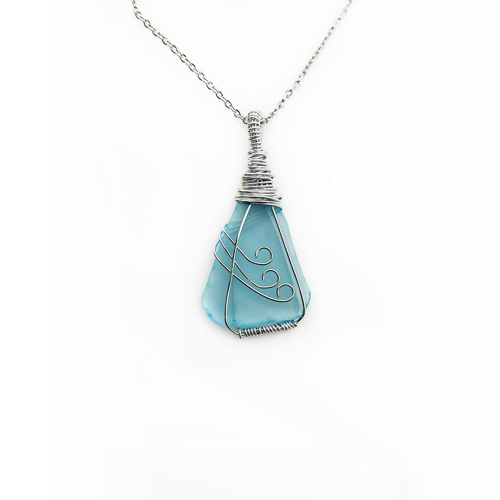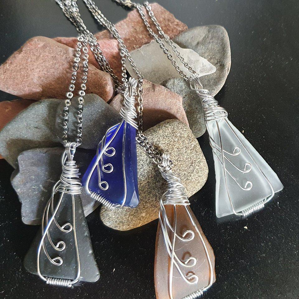 Fashioned from recycled glass, these eye-catching necklaces are one-of-a-kind! The glass is tumbled in sand from the Red Sea to create a soft, sea-glass look before carefully wrapping each piece in round wire scrollwork and attaching them to 18" stainless steel chains. Necklaces come in a unique assortment of shapes and colors, including blues, greens, and browns.